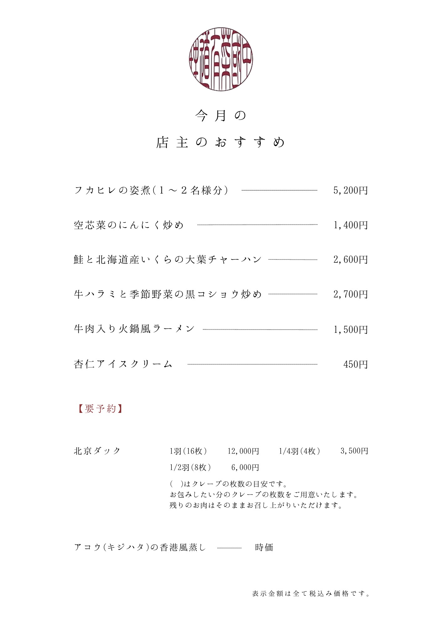 北京ダックとフカヒレのコース | ¥11,000 |