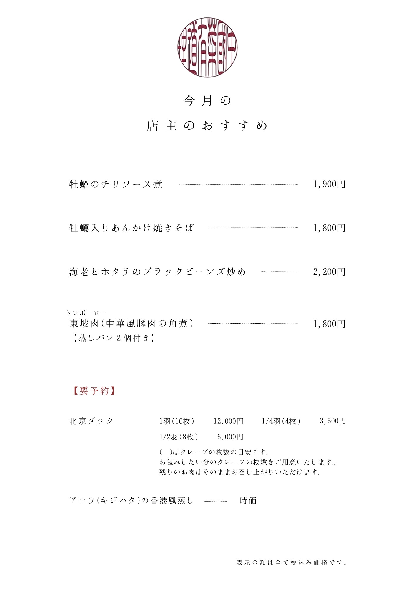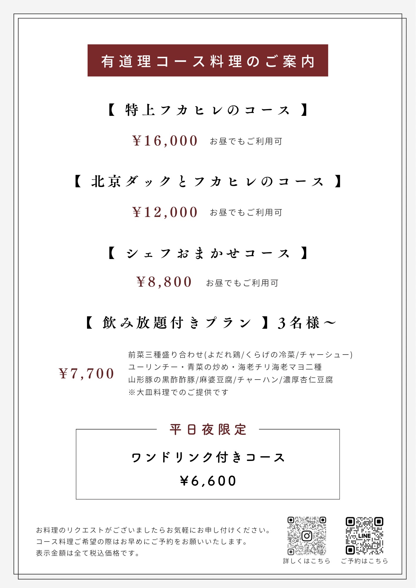 | 北京ダックとフカヒレのコース | ¥11,000 |