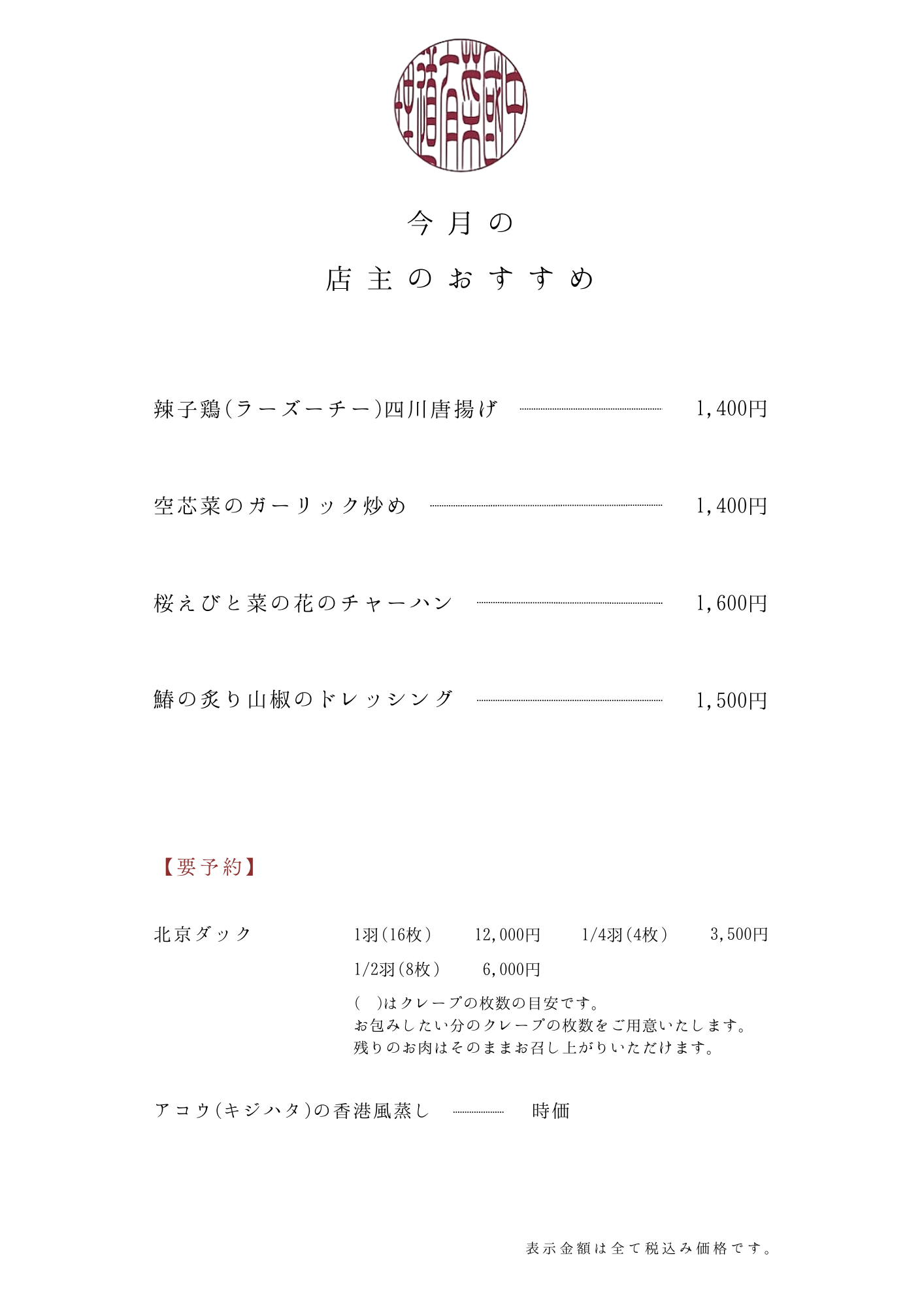| 北京ダックとフカヒレのコース | ¥12,000 |